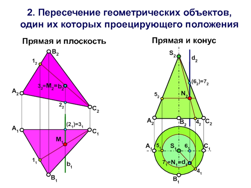2. Пересечение геометрических объектов, один их которых проецирующего положенияПрямая и плоскостьПрямая и конусA1112212(21)=3152B1S2C1B2A2C2S1A2A1B1B2b2b151(62)=72 41d1d24261 32=71= M2=M1N2N1=C1C2