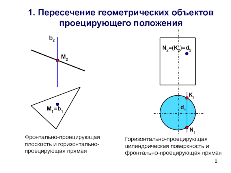 1. Пересечение геометрических объектов проецирующего положенияФронтально-проецирующая плоскость и горизонтально-проецирующая прямаяГоризонтально-проецирующая цилиндрическая поверхность и фронтально-проецирующая прямаяM1=M2b1b2d2d1N2=(K2)=N1K1