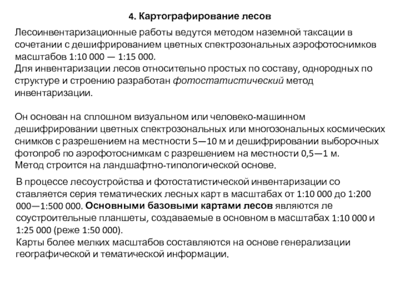 В процессе лесоустройства и фотостатистической инвентаризации составляется серия тематических лесных карт в масштабах от 1:10 000 до 1:200 000—1:500 000. Основными базовыми картами лесов являются лесоустроительные планшеты, создаваемые в основном в масштабах 1:10 000 и 1:25 000 (реже 1:50 000).