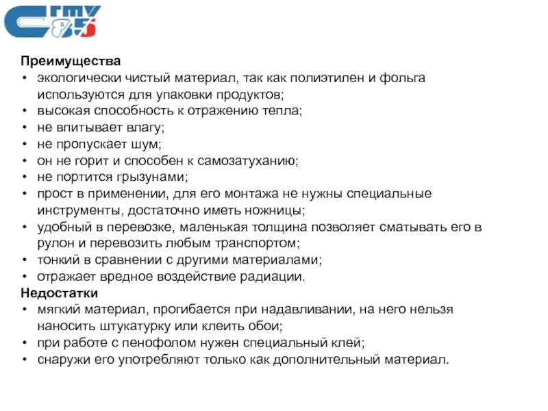 Следует добавить, что пенофол не только теплоизолирует объект, но и является гидроизоляцией, а также пароизоляцией. И, кроме того, защищает помещение от проникновения радиоактивного газа радона - основной ныне в жилых помещениях причины радиоактивного заражения.