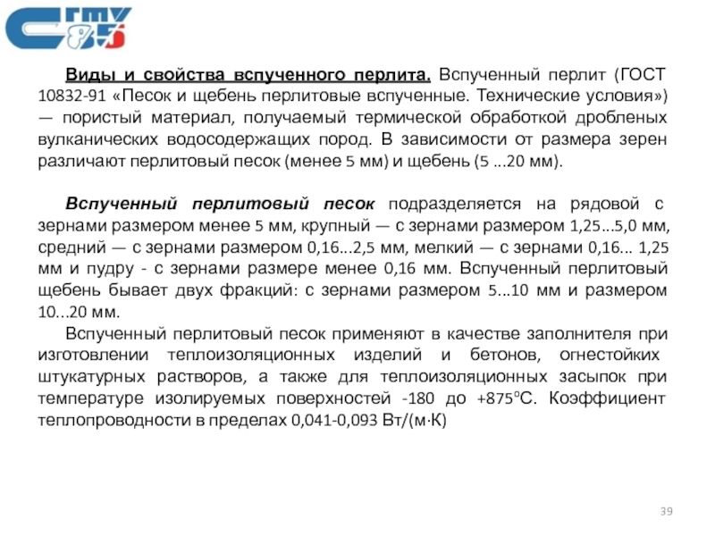 Слайд 39Виды и свойства вспученного перлита. Вспученный перлит (ГОСТ 10832-91 «Песок