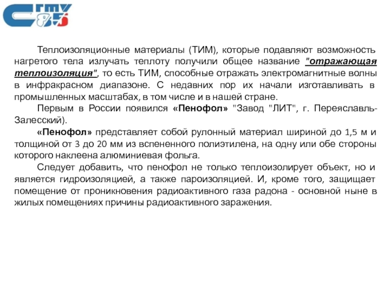 Слайд 7Теплоизоляционные материалы (ТИМ), которые подавляют возможность нагретого тела излучать теплоту