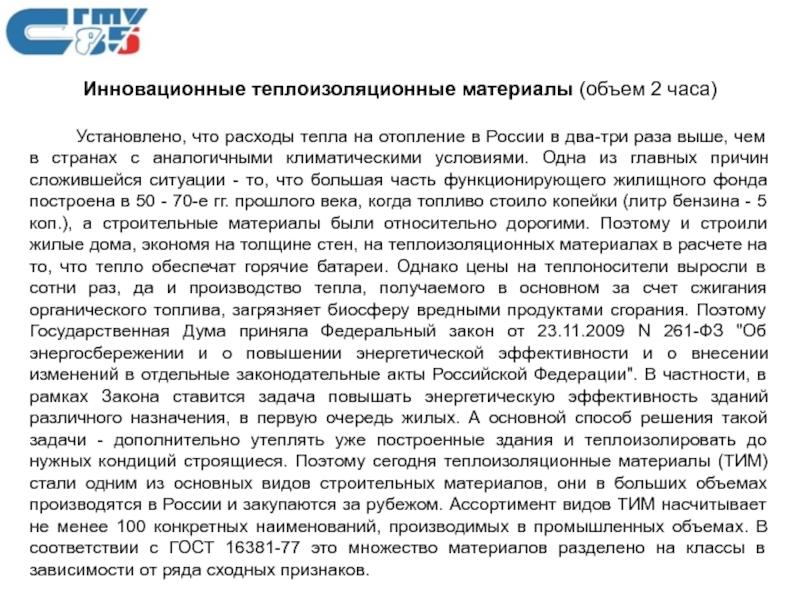 Слайд 2Инновационные теплоизоляционные материалы (объем 2 часа)