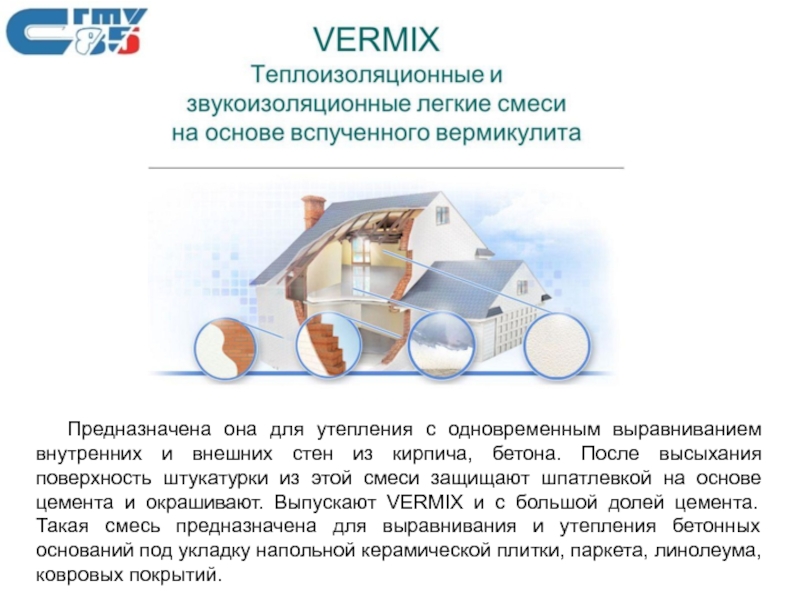смеси защищают шпатлевкой на основе цемента и окрашивают. Выпускают VERMIX и с большой долей цемента. Такая смесь предназначена для выравнивания и утепления бетонных оснований под укладку напольной керамической плитки, паркета, линолеума, ковровых покрытий.