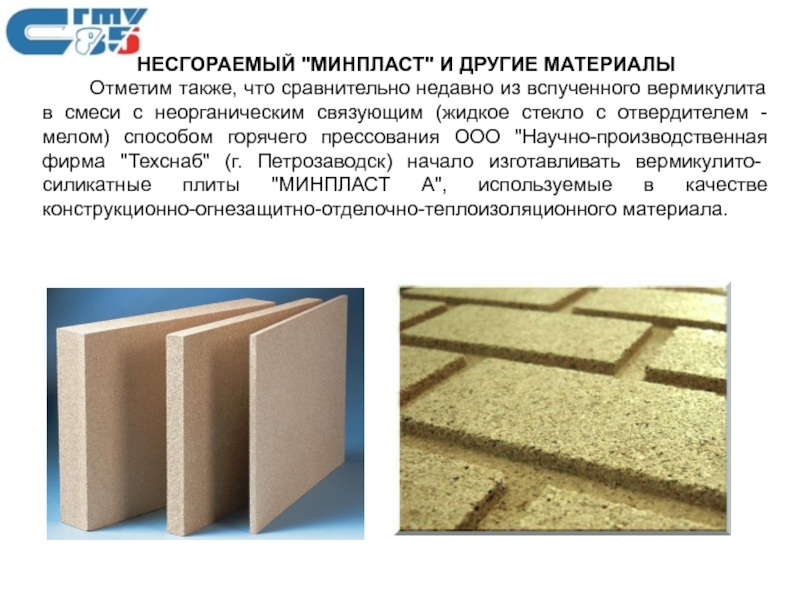 отвердителем - мелом) способом горячего прессования ООО "Научно-производственная фирма "Техснаб" (г. Петрозаводск) начало изготавливать вермикулито-силикатные плиты "МИНПЛАСТ А", используемые в качестве конструкционно-огнезащитно-отделочно-теплоизоляционного материала.