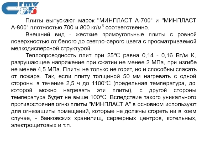 Теплопроводность плит при 25оС равна 0,14 - 0,16 Вт/м К, разрушающее напряжение при сжатии не менее 2 МПа, при изгибе не менее 4,5 МПа. Плиты не только не горят, но и способны спасать от пожара. Так, если плиту толщиной 50 мм нагревать с одной стороны в течение 2,5 ч до 1100оС (предельная температура, до которой можно нагревать эти плиты), с другой стороны температура будет не выше 100оС. Вследствие такого уникального противостояния огню плиты "МИНПЛАСТ А" в основном используют для огнезащиты помещений, которые не должны сгореть ни в коем случае, - банковских хранилищ, серверных центров, котельных, электрощитовых и т.п.