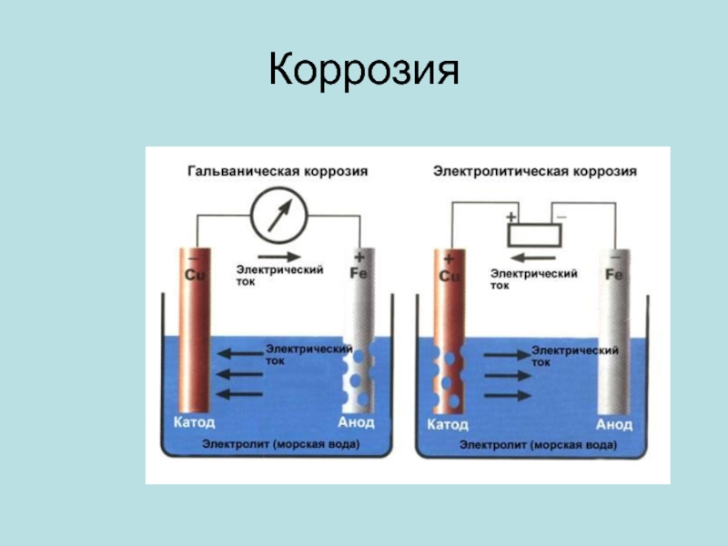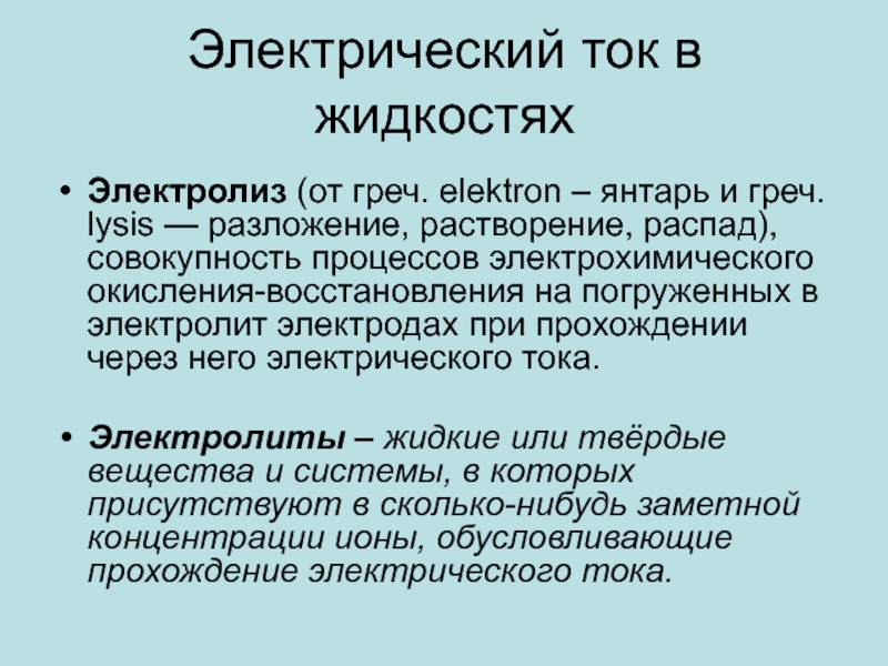 Электрический ток в жидкостяхЭлектролиз (от греч. elektron – янтарь и греч. lysis — разложение, растворение, распад), совокупность