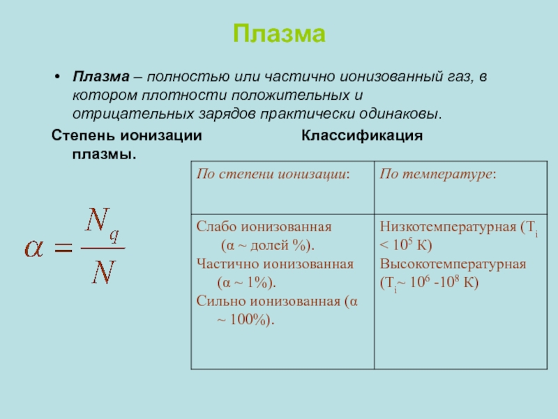 ПлазмаПлазма – полностью или частично ионизованный газ, в котором плотности положительных и отрицательных зарядов практически одинаковы.Степень ионизации