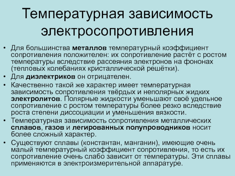 Существуют сплавы (константан, манганин), имеющие очень малый температурный коэффициент сопротивления, то есть их сопротивление очень слабо зависит от температуры. Эти сплавы применяются в электроизмерительной аппаратуре.