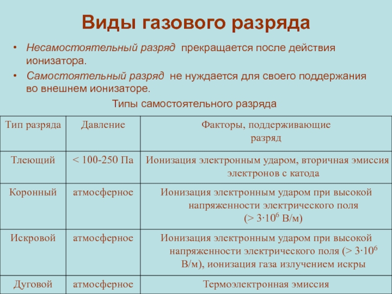 Виды газового разрядаНесамостоятельный разряд прекращается после действия ионизатора.Самостоятельный разряд не нуждается для своего поддержания во внешнем ионизаторе.Типы