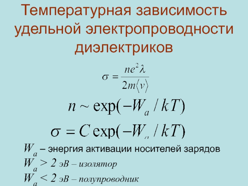 Температурная зависимость удельной электропроводности диэлектриковWa – энергия активации носителей зарядовWa > 2 эВ – изоляторWa < 2