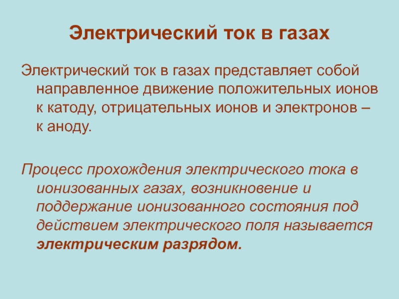 Электрический ток в газах Электрический ток в газах представляет собой направленное движение положительных ионов к катоду, отрицательных