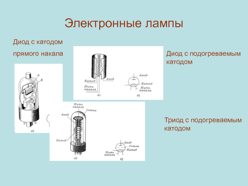 Электронные лампыДиод с катодомпрямого накалаДиод с подогреваемым катодомТриод с подогреваемым катодом