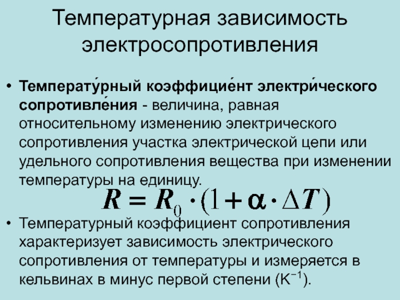 Температурная зависимость электросопротивленияТемперату́рный коэффицие́нт электри́ческого сопротивле́ния - величина, равная относительному изменению электрического сопротивления участка электрической цепи или