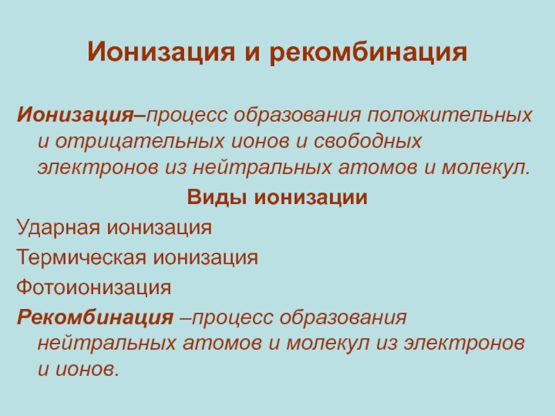 Ионизация и рекомбинацияИонизация–процесс образования положительных и отрицательных ионов и свободных электронов из нейтральных атомов и молекул. Виды