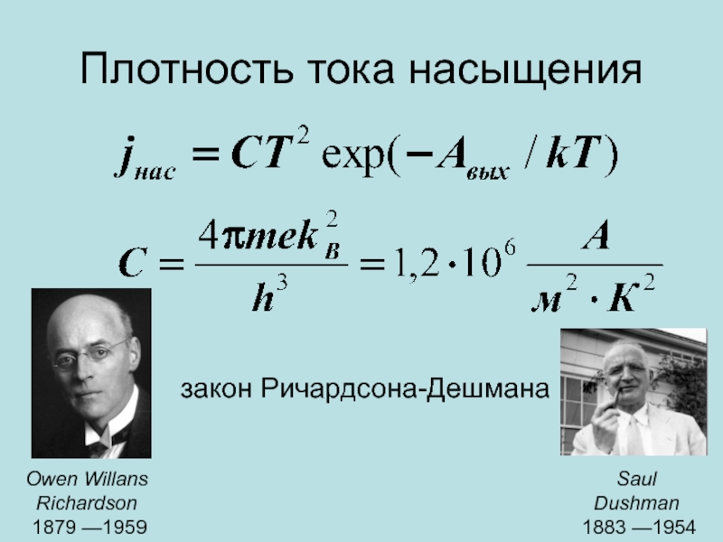 Плотность тока насыщениязакон Ричардсона-ДешманаOwen Willans Richardson 1879 —1959SaulDushman 1883 —1954