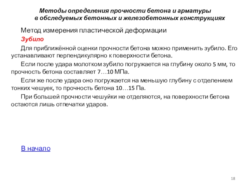 Если после удара молотком зубило погружается на глубину около 5 мм, то прочность бетона составляет 7…10 МПа.