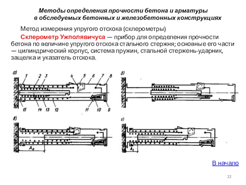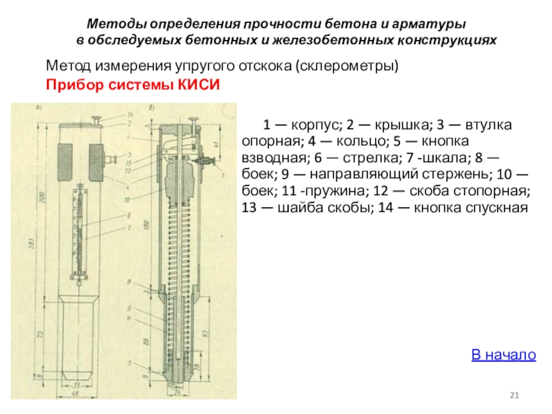 прочности бетона по величине упругого отскока стального стержня; основные его части — цилиндрический корпус, система пружин, стальной стержень-ударник, защелка и указатель отскока.