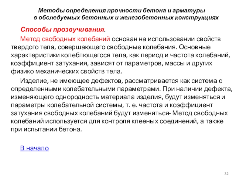 Изделие, не имеющее дефектов, рассматривается как система с определенными колебательными параметрами. При наличии дефекта, изменяющего однородность материала изделия, будут изменяться и параметры колебательной системы, т. е. частота и коэффициент затухания свободных колебаний будут изменяться- Метод свободных колебаний используется для контроля клееных соединений, а также при испытании бетона.