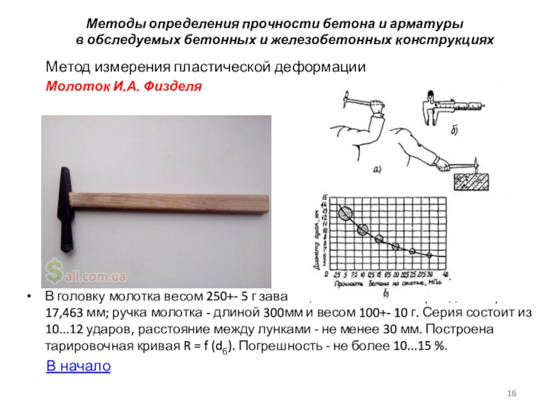 250+- 5 г завальцован стальной шарик диаметром 17,463 мм; ручка молотка - длиной 300мм и весом 100+- 10 г. Серия состоит из 10...12 ударов, расстояние между лунками - не менее 30 мм. Построена тарировочная кривая R = f (dб). Погрешность - не более 10...15 %.