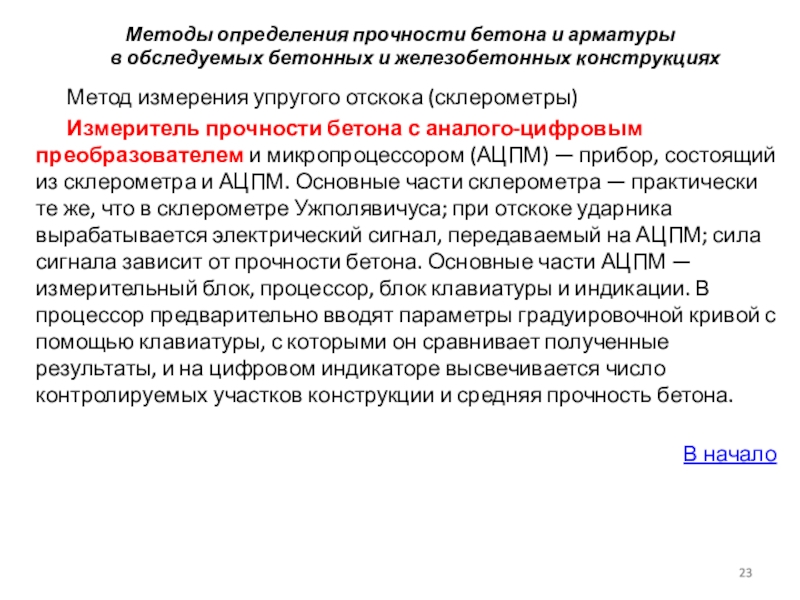 и микропроцессором (АЦПМ) — прибор, состоящий из склерометра и АЦПМ. Основные части склерометра — практически те же, что в склерометре Ужполявичуса; при отскоке ударника вырабатывается электрический сигнал, передаваемый на АЦПМ; сила сигнала зависит от прочности бетона. Основные части АЦПМ — измерительный блок, процессор, блок клавиатуры и индикации. В процессор предварительно вводят параметры градуировочной кривой с помощью клавиатуры, с которыми он сравнивает полученные результаты, и на цифровом индикаторе высвечивается число контролируемых участков конструкции и средняя прочность бетона.