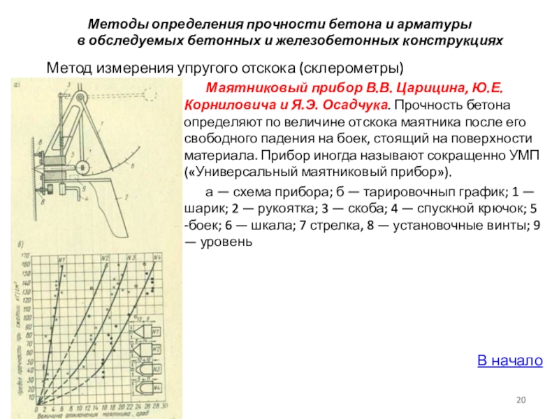 и Я.Э. Осадчука. Прочность бетона определяют по величине отскока маятника после его свободного падения на боек, стоящий на поверхности материала. Прибор иногда называют сокращенно УМП («Универсальный маятниковый прибор»).