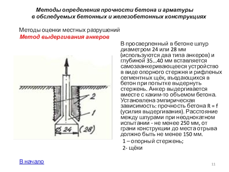 диаметром 24 или 28 мм (используются два типа анкеров) и глубиной 35...40 мм вставляется самозаанкеривающееся устройство в виде опорного стержня и рифленых сегментных щёк, въедающихся в бетон при попытке выдернуть стержень. Анкер выдергивается вместе с каким-то объемом бетона. Установлена эмпирическая зависимость: прочность бетона R = f (усилия выдергивания). Расстояние между шпурами при неоднокатном испытании - не менее 250 мм, от грани конструкции до места отрыва должно быть не менее 150 мм.