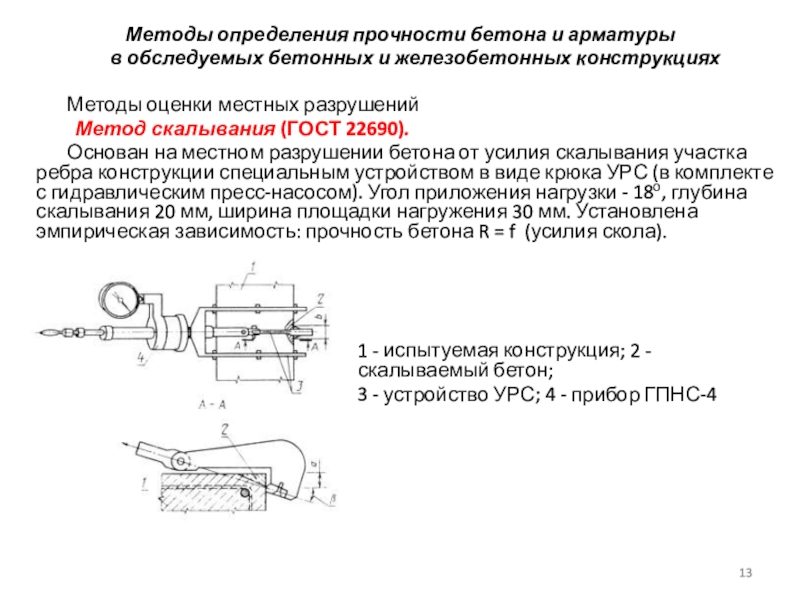 бетона от усилия скалывания участка ребра конструкции специальным устройством в виде крюка УРС (в комплекте с гидравлическим пресс-насосом). Угол приложения нагрузки - 18о, глубина скалывания 20 мм, ширина площадки нагружения 30 мм. Установлена эмпирическая зависимость: прочность бетона R = f (усилия скола).