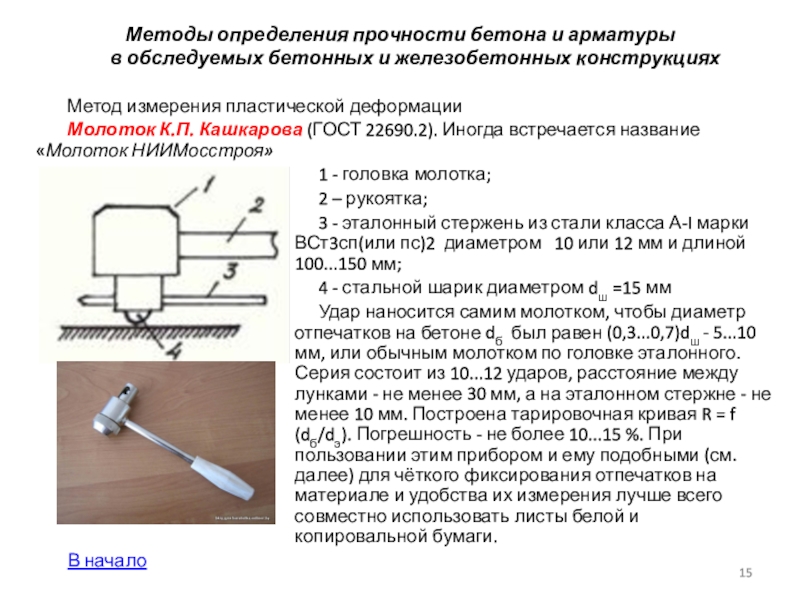 Удар наносится самим молотком, чтобы диаметр отпечатков на бетоне dб был равен (0,3...0,7)dш - 5...10 мм, или обычным молотком по головке эталонного. Серия состоит из 10...12 ударов, расстояние между лунками - не менее 30 мм, а на эталонном стержне - не менее 10 мм. Построена тарировочная кривая R = f (dб/dэ). Погрешность - не более 10...15 %. При пользовании этим прибором и ему подобными (см. далее) для чёткого фиксирования отпечатков на материале и удобства их измерения лучше всего совместно использовать листы белой и копировальной бумаги.