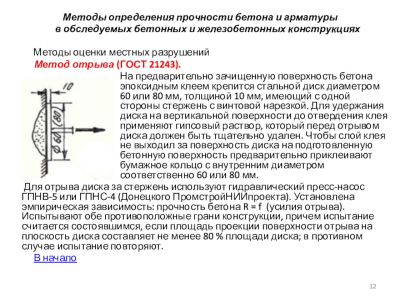 Для отрыва диска за стержень используют гидравлический пресс-насос ГПНВ-5 или ГПНС-4 (Донецкого ПромстройНИИпроекта). Установлена эмпирическая зависимость: прочность бетона R = f (усилия отрыва). Испытывают обе противоположные грани конструкции, причем испытание считается состоявшимся, если площадь проекции поверхности отрыва на плоскость диска составляет не менее 80 % площади диска; в противном случае испытание повторяют.