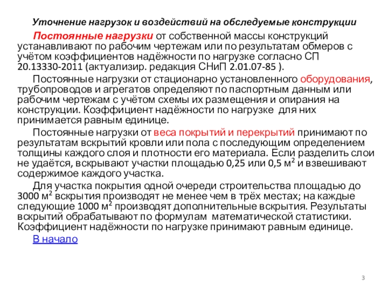 Постоянные нагрузки от веса покрытий и перекрытий принимают по результатам вскрытий кровли или пола с последующим определением толщины каждого слоя и плотности его материала. Если разделить слои не удаётся, вскрывают участки площадью 0,25 или 0,5 м2 и взвешивают содержимое каждого участка.