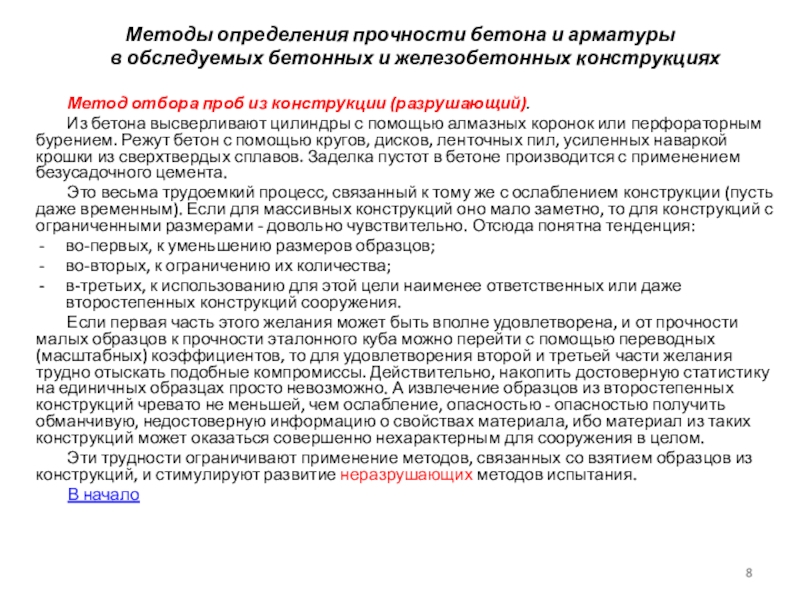 Разрушающие методы - это стандартизированные испытания отобранных из конструкции проб-образцов материала (методы отбора проб из конструкции). Методики испытаний образцов - те же, что и для бетонных кубов, призм и балочек, изготовленных одновременно с конструкцией, или образцов стали и арматуры от соответствующей партии металла.