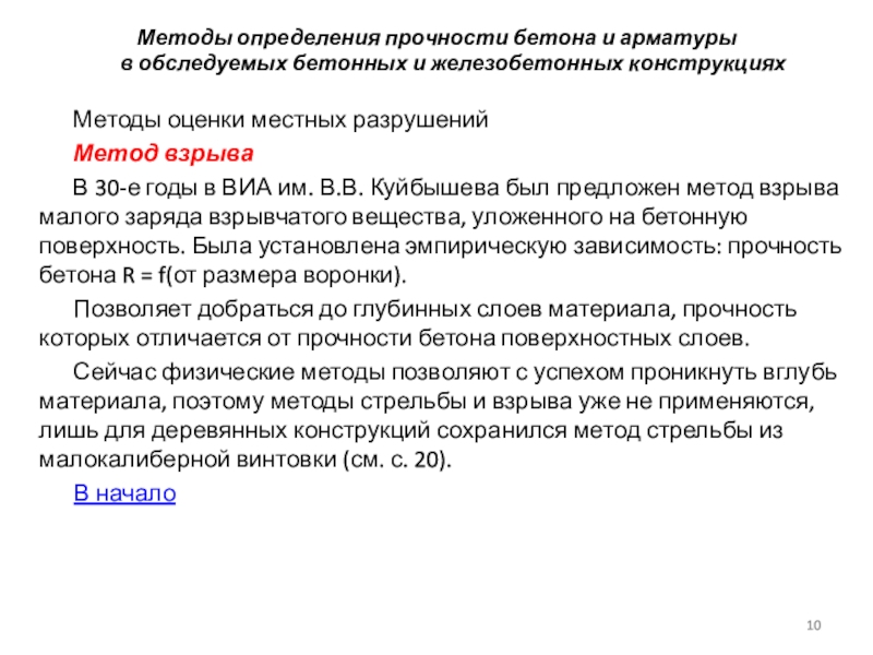 В.В. Куйбышева был предложен метод взрыва малого заряда взрывчатого вещества, уложенного на бетонную поверхность. Была установлена эмпирическую зависимость: прочность бетона R = f(от размера воронки).