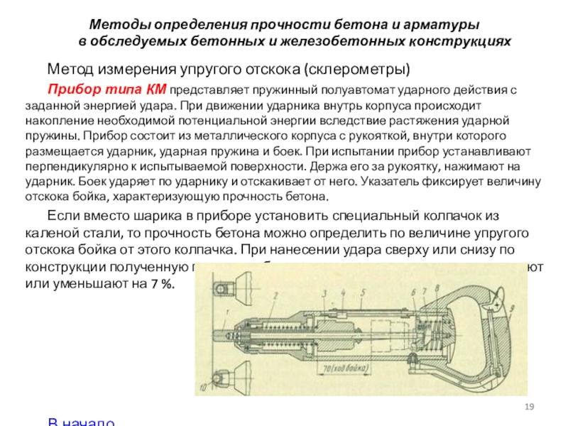 ударного действия с заданной энергией удара. При движении ударника внутрь корпуса происходит накопление необходимой потенциальной энергии вследствие растяжения ударной пружины. Прибор состоит из металлического корпуса с рукояткой, внутри которого размещается ударник, ударная пружина и боек. При испытании прибор устанавливают перпендикулярно к испытываемой поверхности. Держа его за рукоятку, нажимают на ударник. Боек ударяет по ударнику и отскакивает от него. Указатель фиксирует величину отскока бойка, характеризующую прочность бетона.