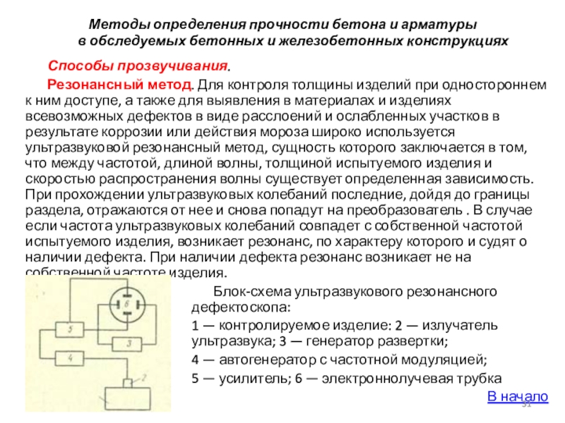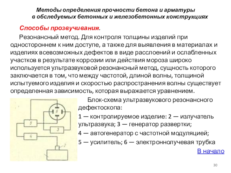 к ним доступе, а также для выявления в материалах и изделиях всевозможных дефектов в виде расслоений и ослабленных участков в результате коррозии или действия мороза широко используется ультразвуковой резонансный метод, сущность которого заключается в том, что между частотой, длиной волны, толщиной испытуемого изделия и скоростью распространения волны существует определенная зависимость. При прохождении ультразвуковых колебаний последние, дойдя до границы раздела, отражаются от нее и снова попадут на преобразователь . В случае если частота ультразвуковых колебаний совпадет с собственной частотой испытуемого изделия, возникает резонанс, по характеру которого и судят о наличии дефекта. При наличии дефекта резонанс возникает не на собственной частоте изделия.