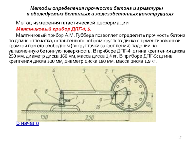 позволяет определить прочность бетона по длине отпечатка, оставленного ребром круглого диска с цементированной кромкой при его свободном (вокруг точки закрепления) падении на увлажненную бетонную поверхность. В приборе ДПГ-4: длина крепления диска 250 мм, диаметр диска 160 мм, масса диска 1,4 кг. В приборе ДПГ-5: длина крепления диска 300 мм, диаметр диска 180 мм, масса диска 1,9 кг.