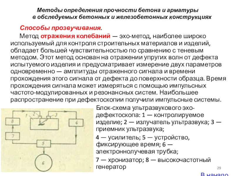 для контроля строительных материалов и изделий, обладает большей чувствительностью по сравнению с теневым методом. Этот метод основан на отражении упругих волн от дефекта испытуемого изделия и предусматривает измерение двух параметров одновременно — амплитуды отраженного сигнала и времени прохождения этого сигнала от дефекта до поверхности образца. Время прохождения сигнала может измеряться с помощью импульсных частото-модулированных и резонансных систем. Наибольшее распространение при дефектоскопии получили импульсные системы.