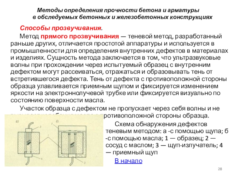 других, отличается простотой аппаратуры и используется в промышленности для определения внутренних дефектов в материалах и изделиях. Сущность метода заключается в том, что ультразвуковые волны при прохождении через испытуемый образец с внутренним дефектом могут рассеиваться, отражаться и образовывать тень от встретившегося дефекта. Тень от дефекта с противоположной стороны образца улавливается приемным щупом и фиксируется изменением яркости на электроннолучевой трубке или фиксируется визуально по состоянию поверхности масла.