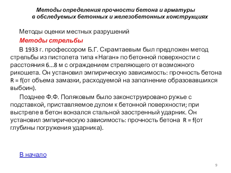 был предложен метод стрельбы из пистолета типа «Наган» по бетонной поверхности с расстояния 6...8 м с ограждением стреляющего от возможного рикошета. Он установил эмпирическую зависимость: прочность бетона R = f(от объема замазки, расходуемой на заполнение образовавшихся выбоин).