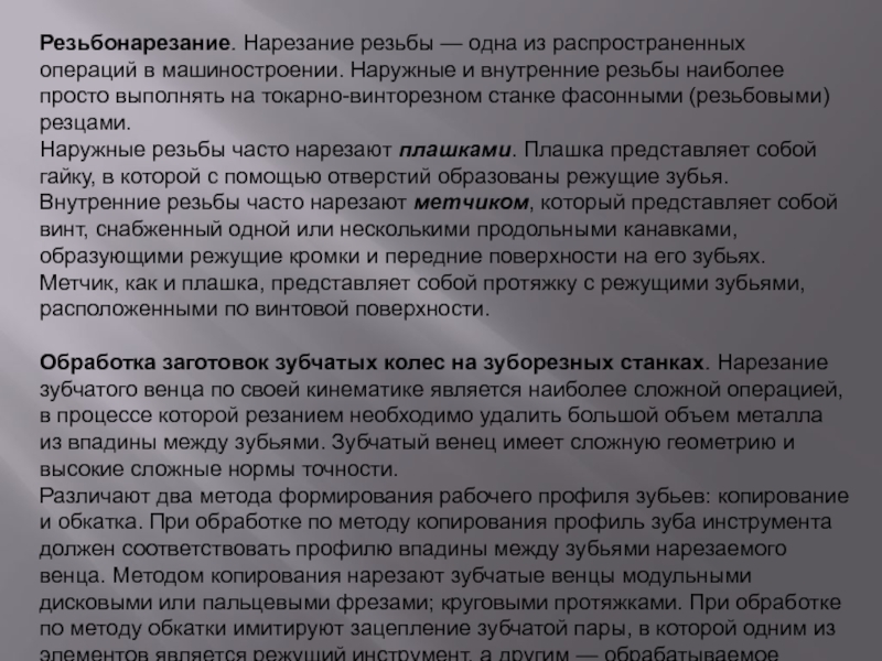 Слайд 9Резьбонарезание. Нарезание резьбы — одна из распространенных операций в машиностроении. Наружные