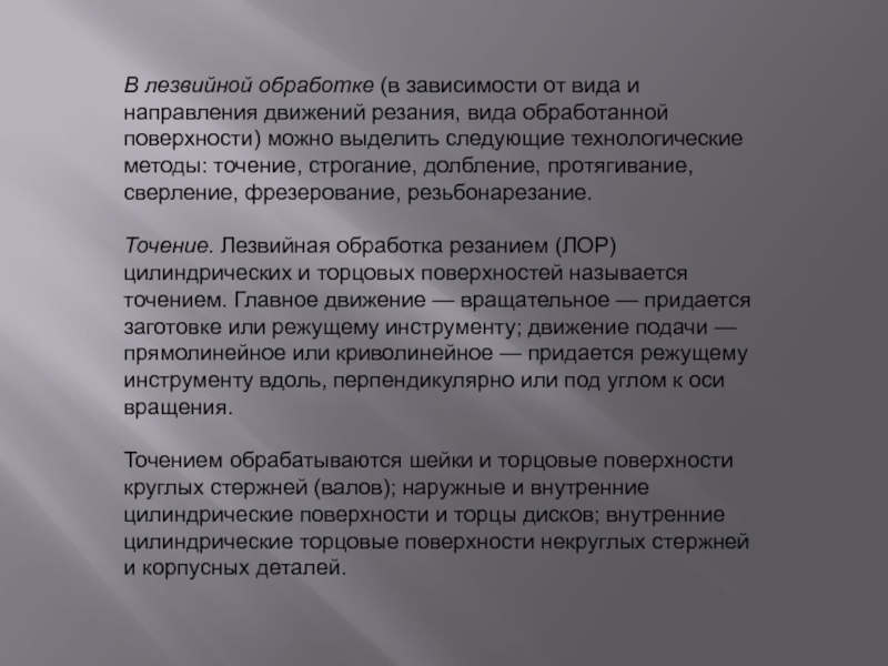 Точение. Лезвийная обработка резанием (ЛОР) цилиндрических и торцовых поверхностей называется точением. Главное движение — вращательное — придается заготовке или режущему инструменту; движение подачи — прямолинейное или криволинейное — придается режущему инструменту вдоль, перпендикулярно или под углом к оси вращения.