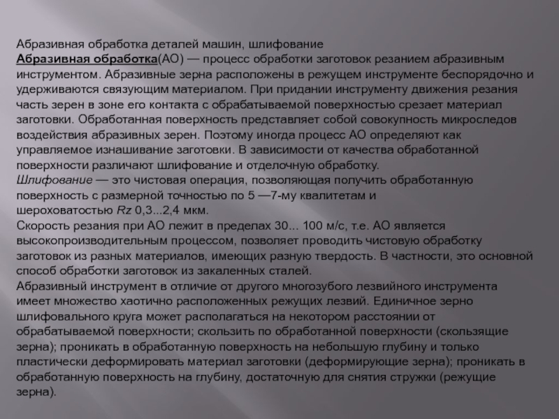 и удерживаются связующим материалом. При придании инструменту движения резания часть зерен в зоне его контакта с обрабатываемой поверхностью срезает материал заготовки. Обработанная поверхность представляет собой совокупность микроследов воздействия абразивных зерен. Поэтому иногда процесс АО определяют как управляемое изнашивание заготовки. В зависимости от качества обработанной поверхности различают шлифование и отделочную обработку.