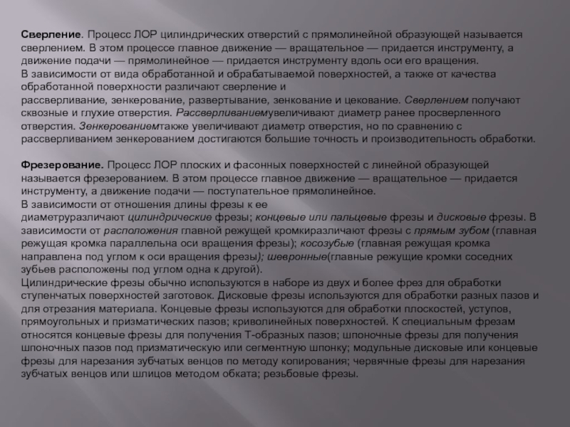 Слайд 8Сверление. Процесс ЛОР цилиндрических отверстий с прямолинейной образующей называется сверлением. В