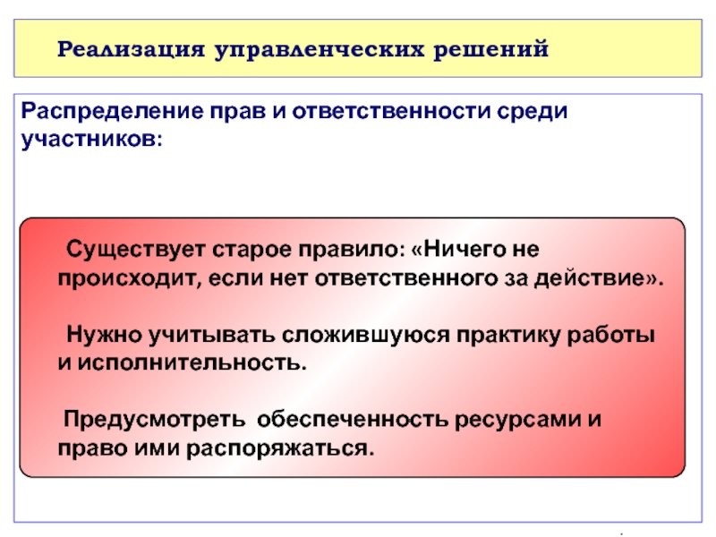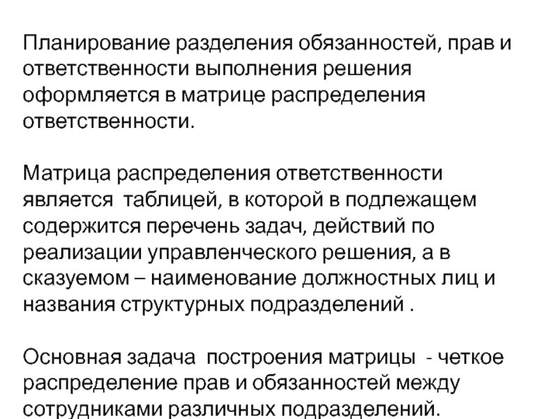 Слайд 14Планирование разделения обязанностей, прав и ответственности выполнения решения оформляется в