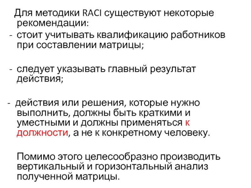 Слайд 22 Для методики RACI существуют некоторые рекомендации: