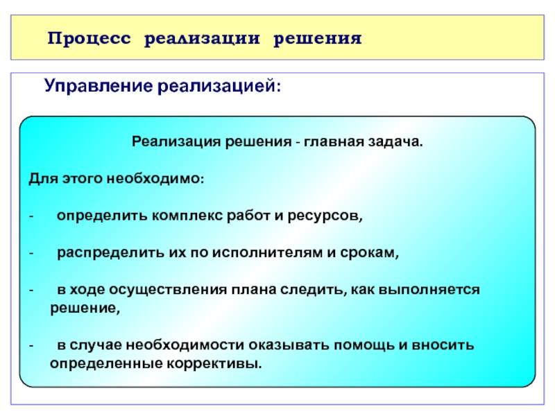 Наиболее распространенная ошибка менеджеров – предположение, что если выбор решения сделан, то решение обязательно будет выполнено.