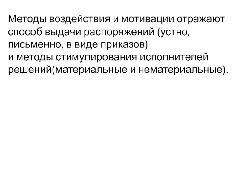 Слайд 32Методы воздействия и мотивации отражают способ выдачи распоряжений (устно, письменно,