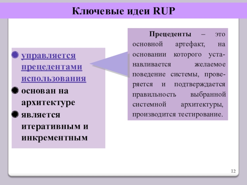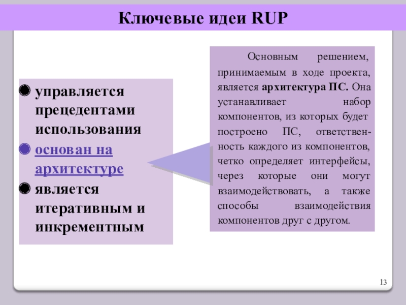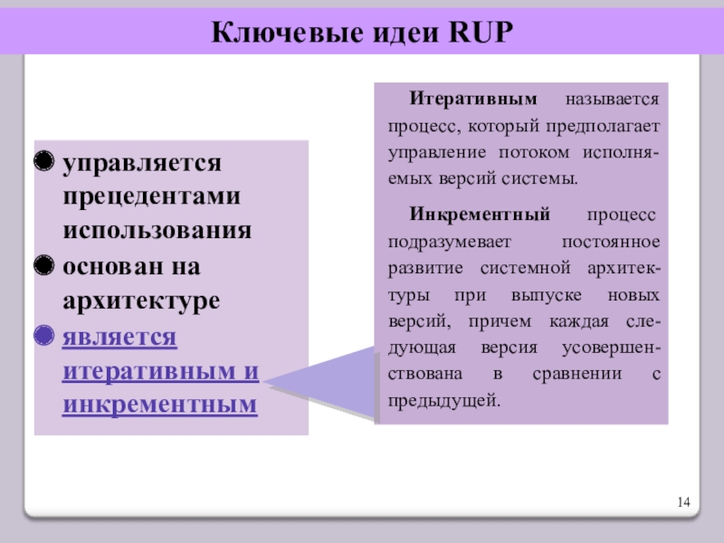 процесс подразумевает постоянное развитие системной архитек-туры при выпуске новых версий, причем каждая сле-дующая версия усовершен-ствована в сравнении с предыдущей.
