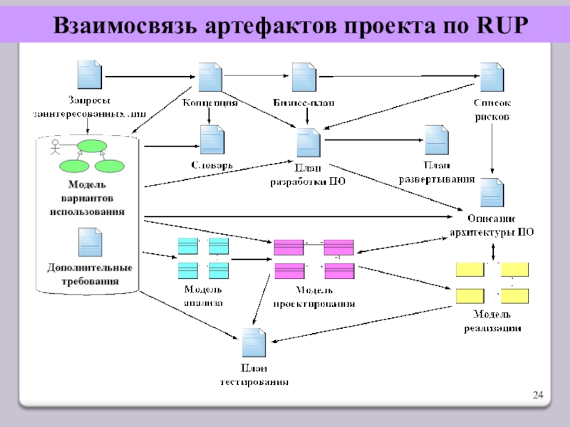 Слайд 24Взаимосвязь артефактов проекта по RUP