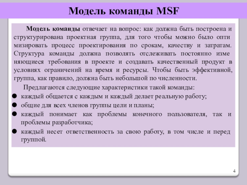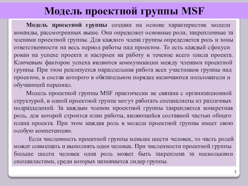 Модель проектной группы MSF практически не связана с организационной структурой, в одной проектной группе могут работать специалисты из различных подразделений. За каждым членом проектной группы закрепляется конкретная роль, для которой строится план работы, являющийся составной частью общего плана проекта. При этом каждая роль в модели проектной группы имеет свою особую компетенцию.